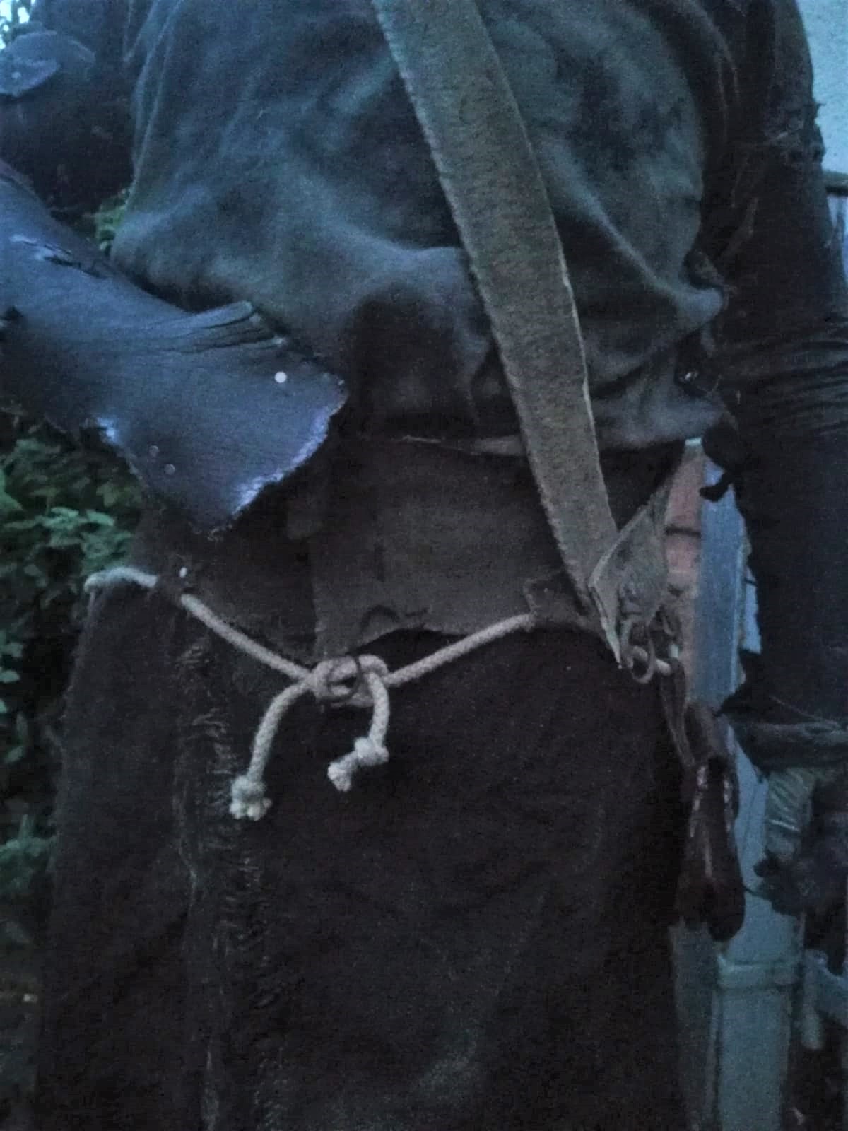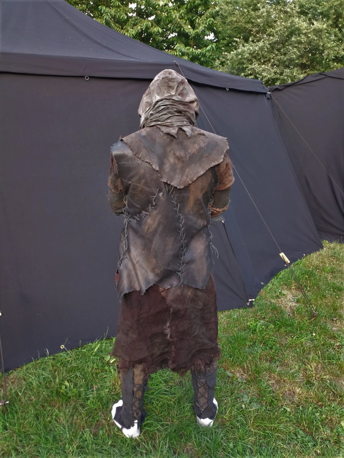 Die Farbgebung der Stoff-Teile zwar gewohnt im skull-Batik, jedoch insgesamt wie bei wislak schon deutlich dunkler als früher, und nur deswegen immer noch benutzt, da wie wir finden, dadurch eine einheitliche Fläche relativ gut gebrochen wird, und ein schön modrig verottender Look entsteht. Einzig der eine beinwickel wirkt mir noch sehr hell, bzw fast blau, aber da haben wir einen kleinen fundus, aus dem wir schönere suchen können, und der liebe gnack ist glaub auch ein bisschen kleiner als ich, da wird der rupfen Rock eh das meiste verdecken...