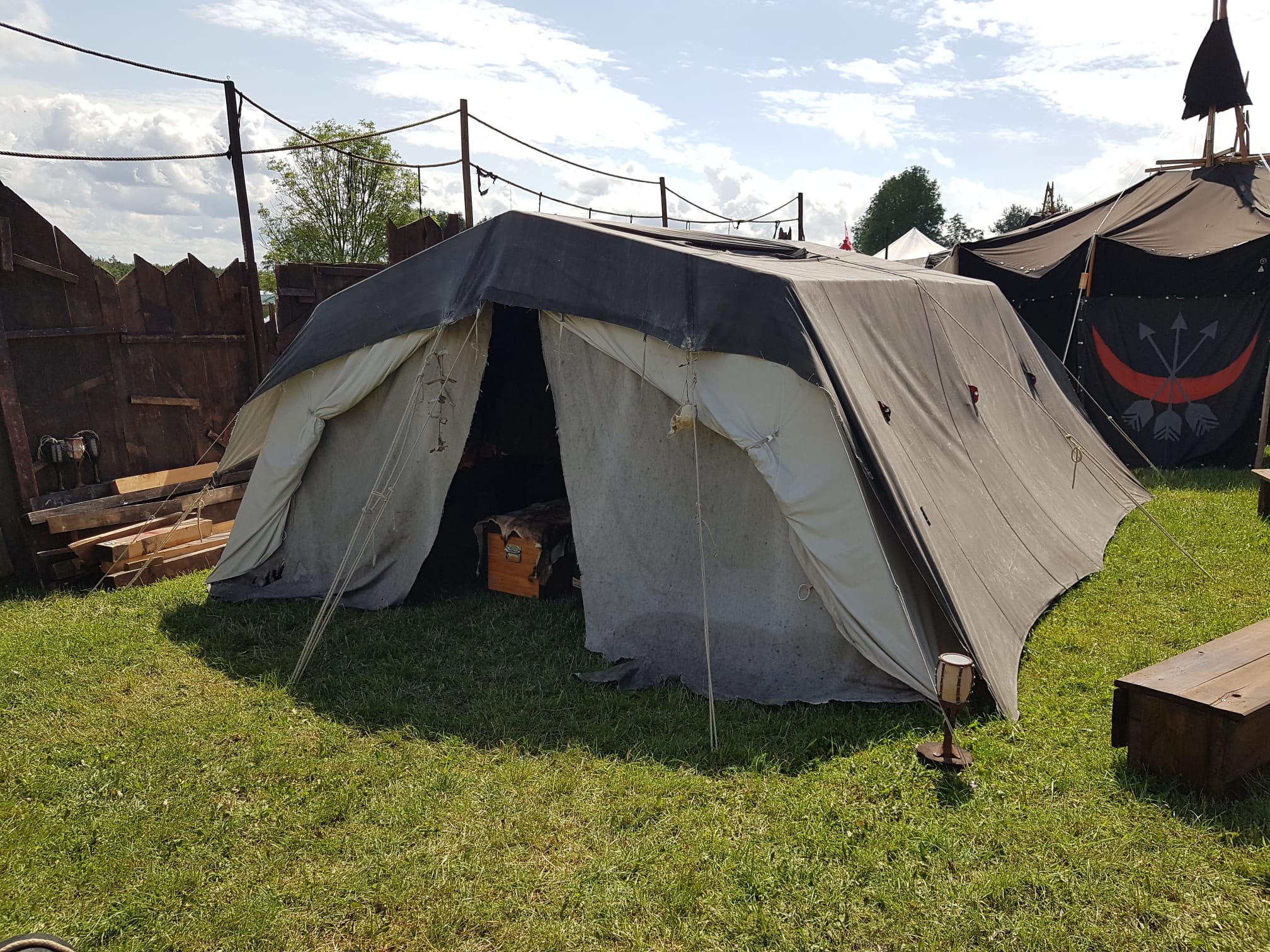 Ich habe ein Rundzelt (4m Durchmesser+Abspannung) Dazu kommt ein 3x6m Tarp vor unseren Zelten (meist bei Harri und Blotzi in der Nähe)