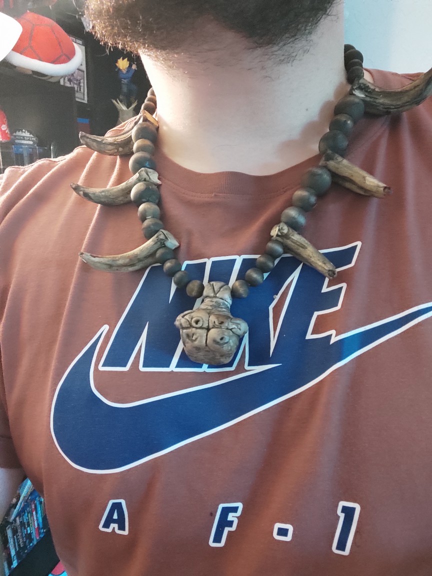 Einmal mit ner Beinschnitzerei der großen Mutter und einmal mit der Faust des Vernichters