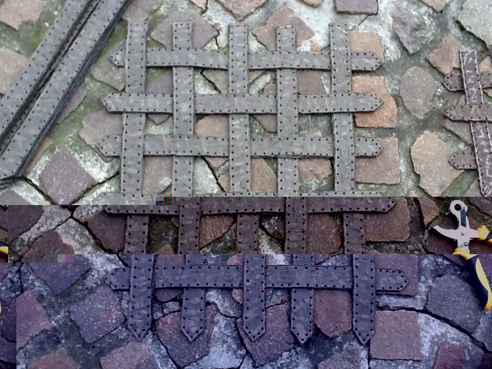 5. Schritt: Da man sieht, dass es mehrere Lederschichten/Riemen sind und das spätere "verorken" (Einsiffen und mit Gebrauchspuren versehen) aufgrund der späteren Lederbandnaht mühseliger wird, kommt jetzt bereits die Holzraspel zum Einsatz. Die Kanten der Riemen werden an die Kante eines Pflastersteins gelegt und rau geraspelt. Schürfstellen werden auf den Riemenflächen eingeraspelt und angeraut und mit der Kante der Holzraspel werden Macken reingesägt. Mit der handlichen, kleinen Säge wird jeder Riemen mit Schnitten versetzt. (Cuttermesser tut's auch.)