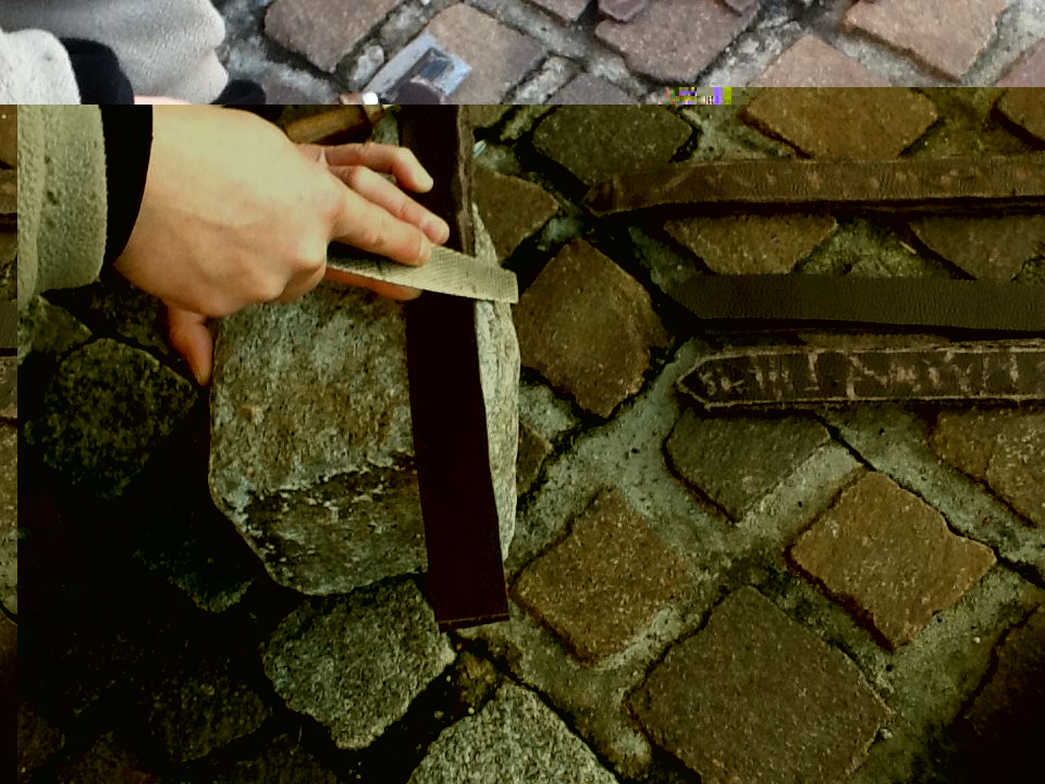 5. Schritt: Da man sieht, dass es mehrere Lederschichten/Riemen sind und das spätere "verorken" (Einsiffen und mit Gebrauchspuren versehen) aufgrund der späteren Lederbandnaht mühseliger wird, kommt jetzt bereits die Holzraspel zum Einsatz. Die Kanten der Riemen werden an die Kante eines Pflastersteins gelegt und rau geraspelt. Schürfstellen werden auf den Riemenflächen eingeraspelt und angeraut und mit der Kante der Holzraspel werden Macken reingesägt. Mit der handlichen, kleinen Säge wird jeder Riemen mit Schnitten versetzt. (Cuttermesser tut's auch.)