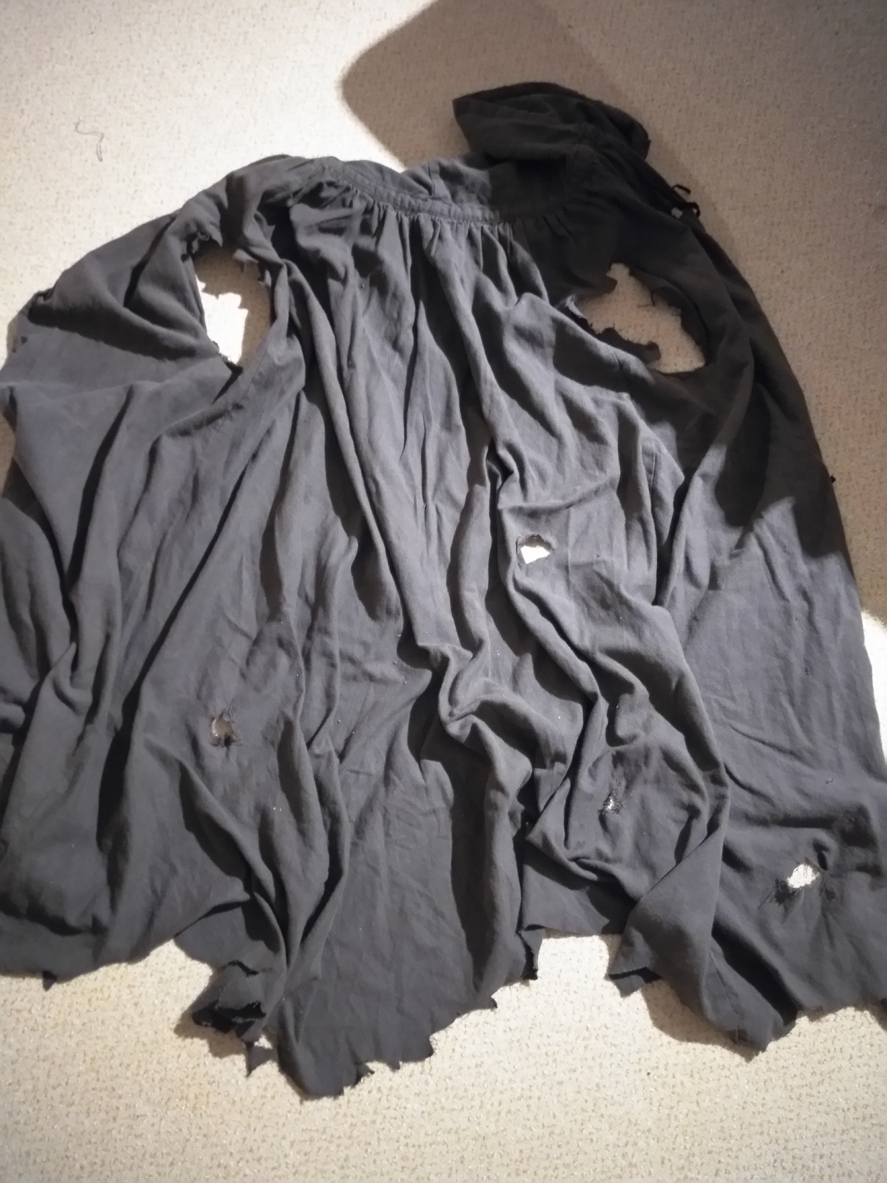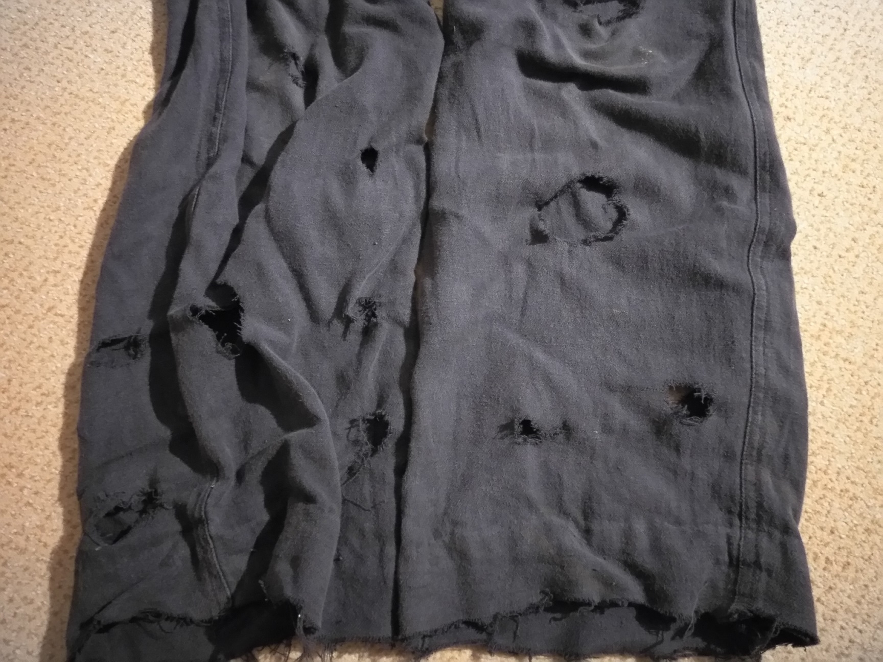 (es muss so aussehen als hättest du die klamotte schon jahrelang an ohne sie zu waschen: aufgeschürfte ellebogen, grob geflickte risse, fettflecken, blutflecken, kotzflecken...)