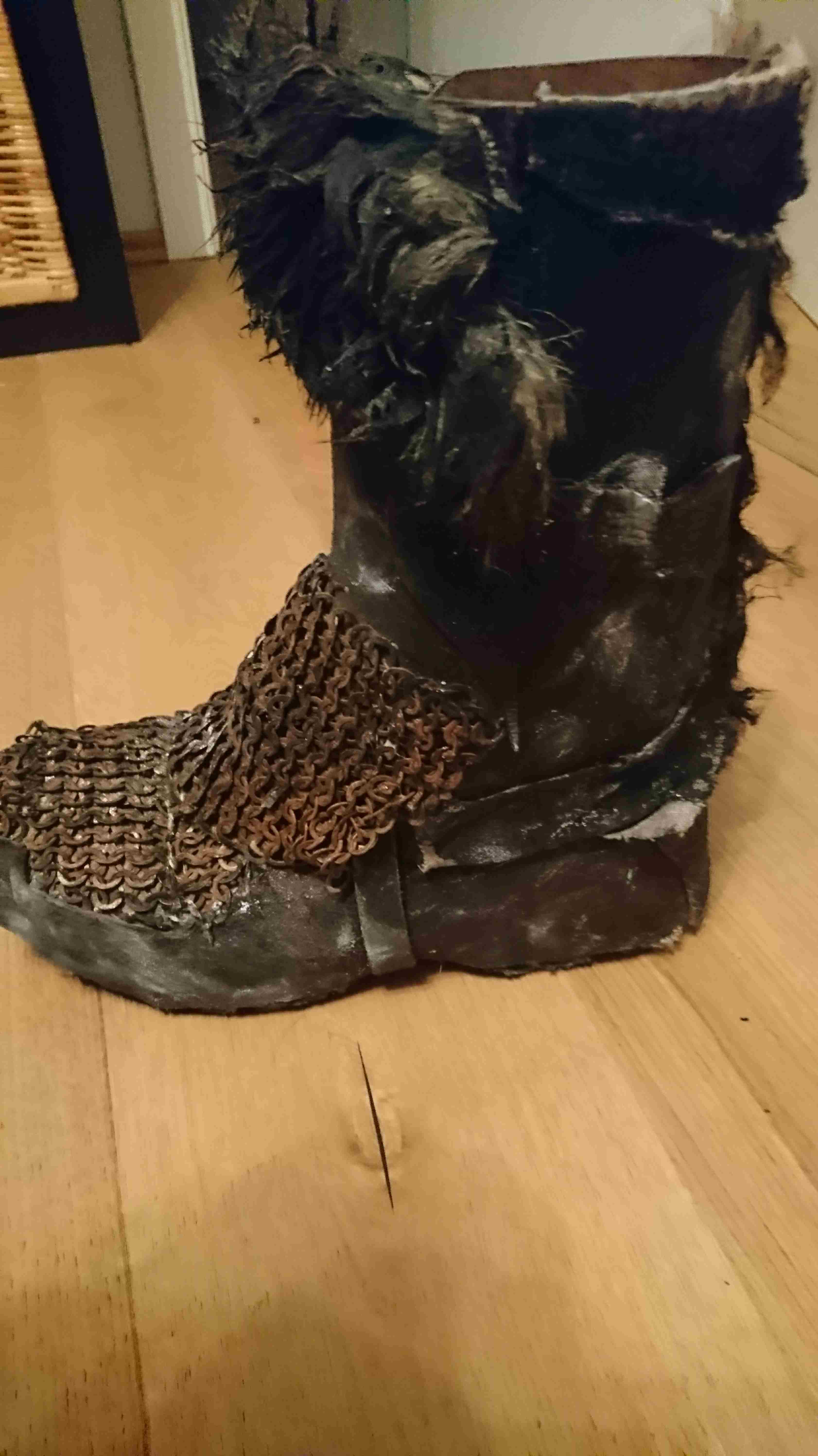 Hatte erst überlegt, die Stiefel nur mit Leder zu verkleiden. Dann wäre das befestigen der Kette aber deutlich schwerer gewesen.