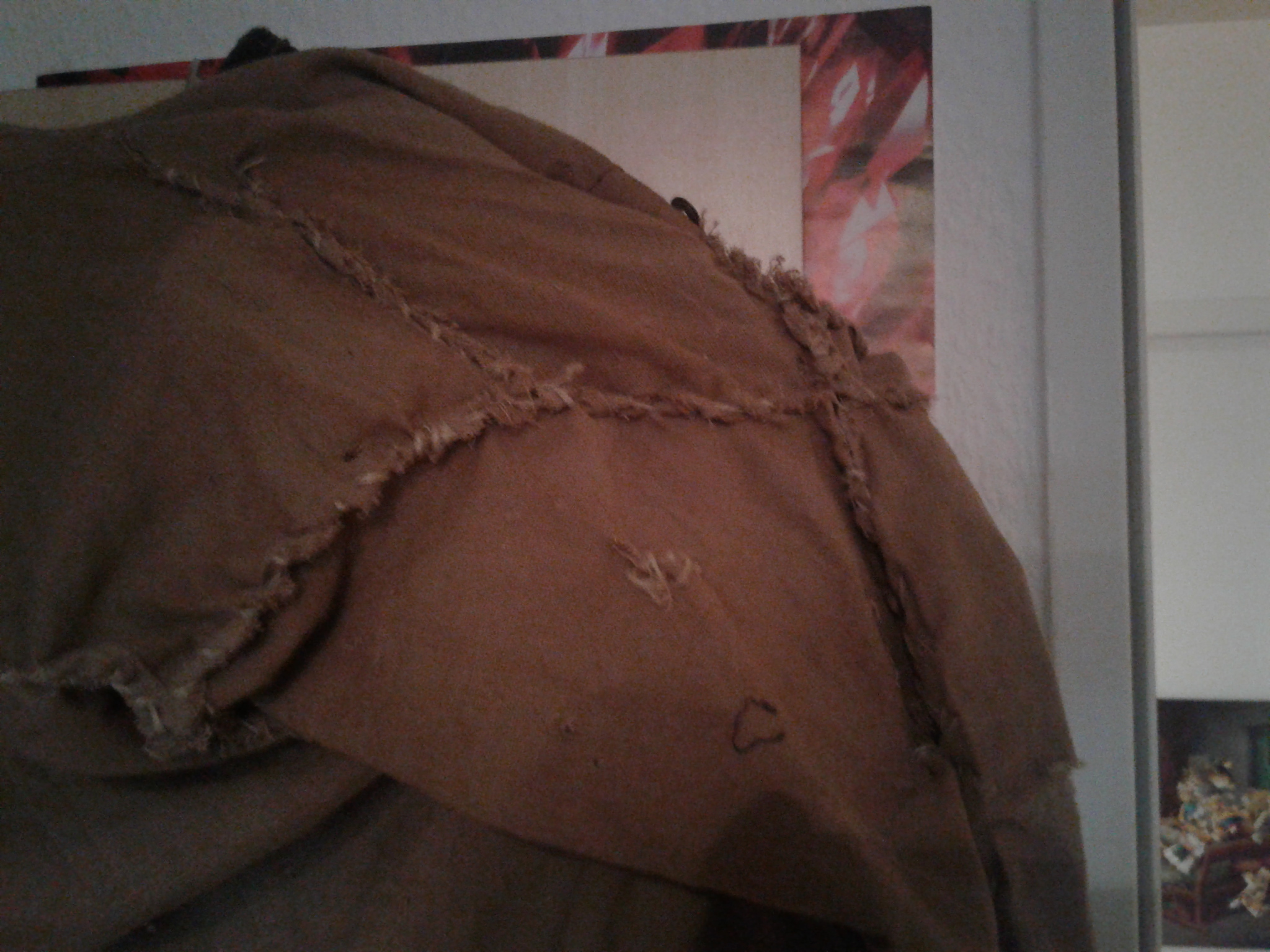Achso mit Paketband meinen wir die reine Naturfaser. Nicht das mit Plastik versetzte bzw gezwirbelte. Das Hemd würde ich generell noch abdunkeln bzw schön verdrecken. Denke es mit Stark verdünnter Schwarzer Acrylfarbe zu sprenkeln (Also Konsistens Pfützenwasser) könnte schon einiges rausholen. Am besten mit nem Schwamm tupfen oder drüber auswringen, und vllt darauf achten das das Hemd an den Armeln und am Saum natürlich mehr verdreckt aussieht.