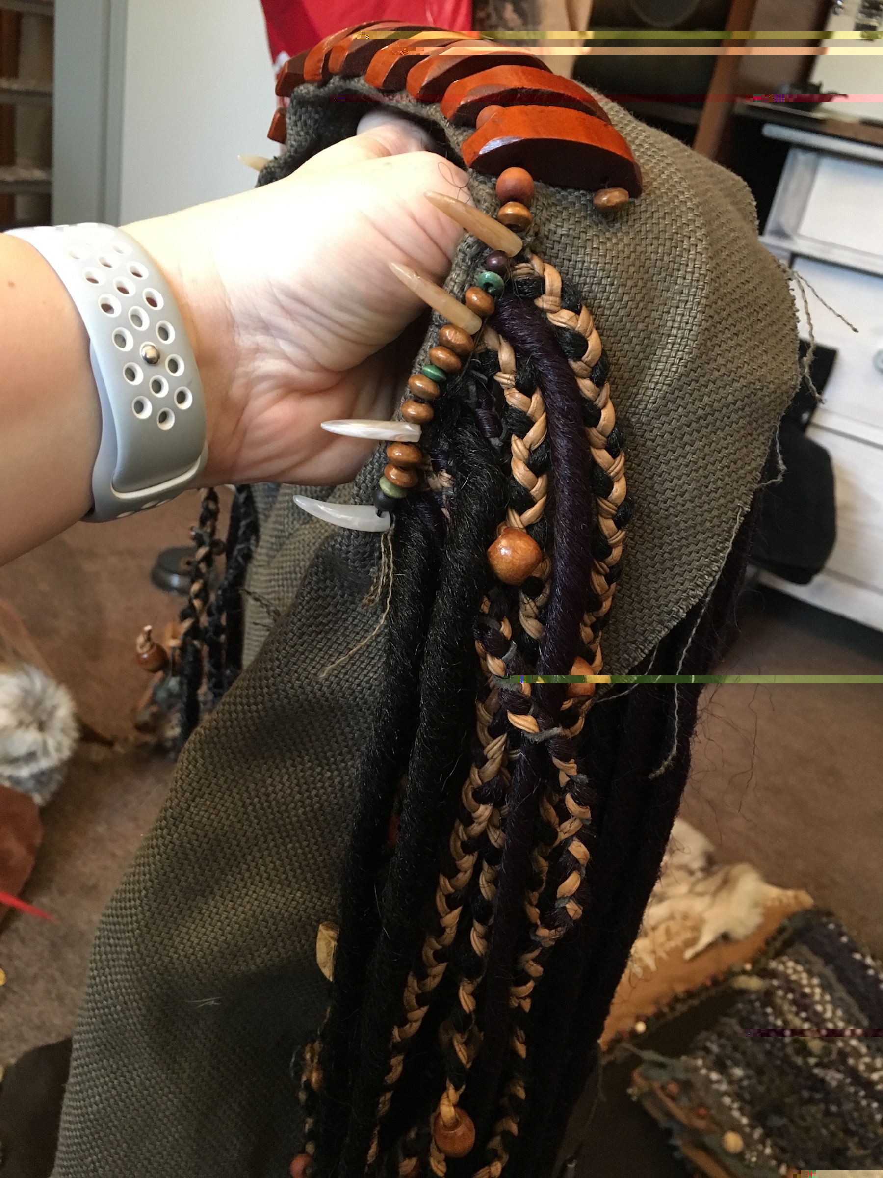Wappenlappen mit der Harpiye, an jedem unteren Ende ist ein Talismann angenäht, Holz, Horn, Metal und Muschel