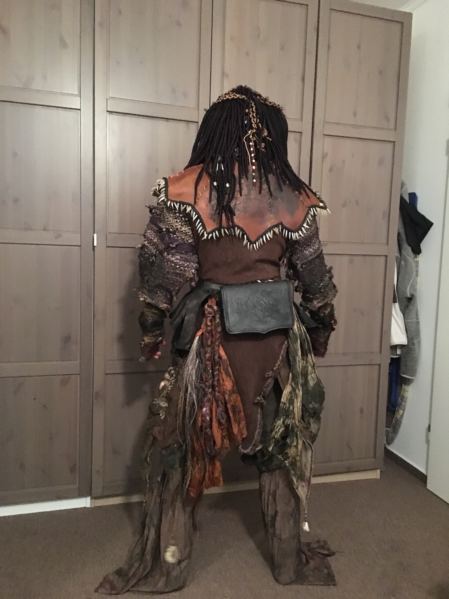 Umhang ist ursprünglich von einem anderen Kostüm. Da habe ich nur noch mehr Flicken, Fell und Kram raufgenäht. Ach ja, und Dreck!
