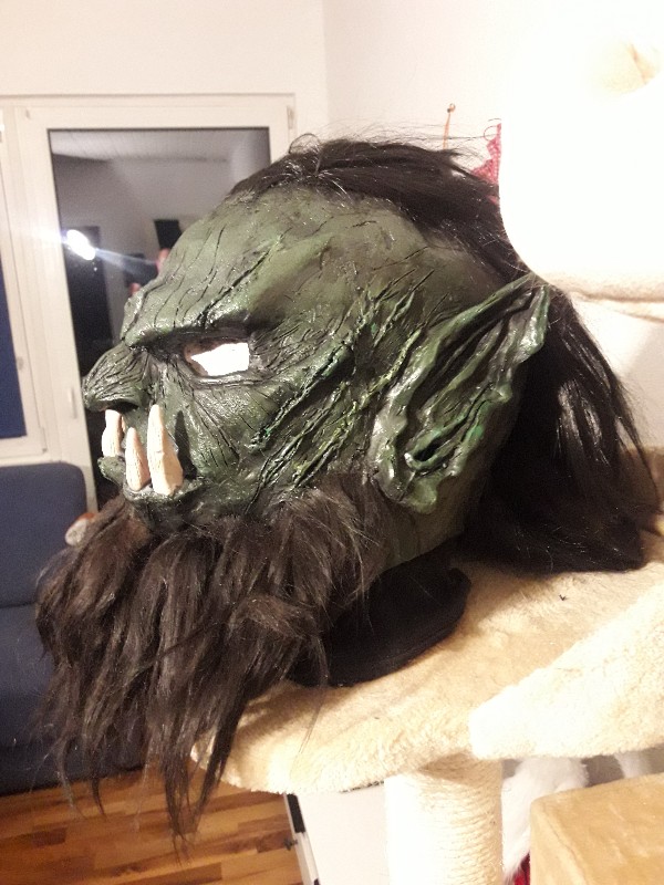 Maske bemalen: Hol dir ne Packung Schminkschwämme. Die von Eulenspiegel zb. Gibt's im Bastelladen. 3 Stück kosten ca 2€. Und dann holst dir Textilfarbe/Stoffmalfarbe. Dein Ork soll schwarz werden. Ok dann brauchst du schwarz. Hau nen Kleks Farbe auf ein Stück Pappe und Tupfe die Farbe mit dem Schwamm auf die Maske. Am besten hängt die Maske dabei auf dem Kopfmodell o.ä.