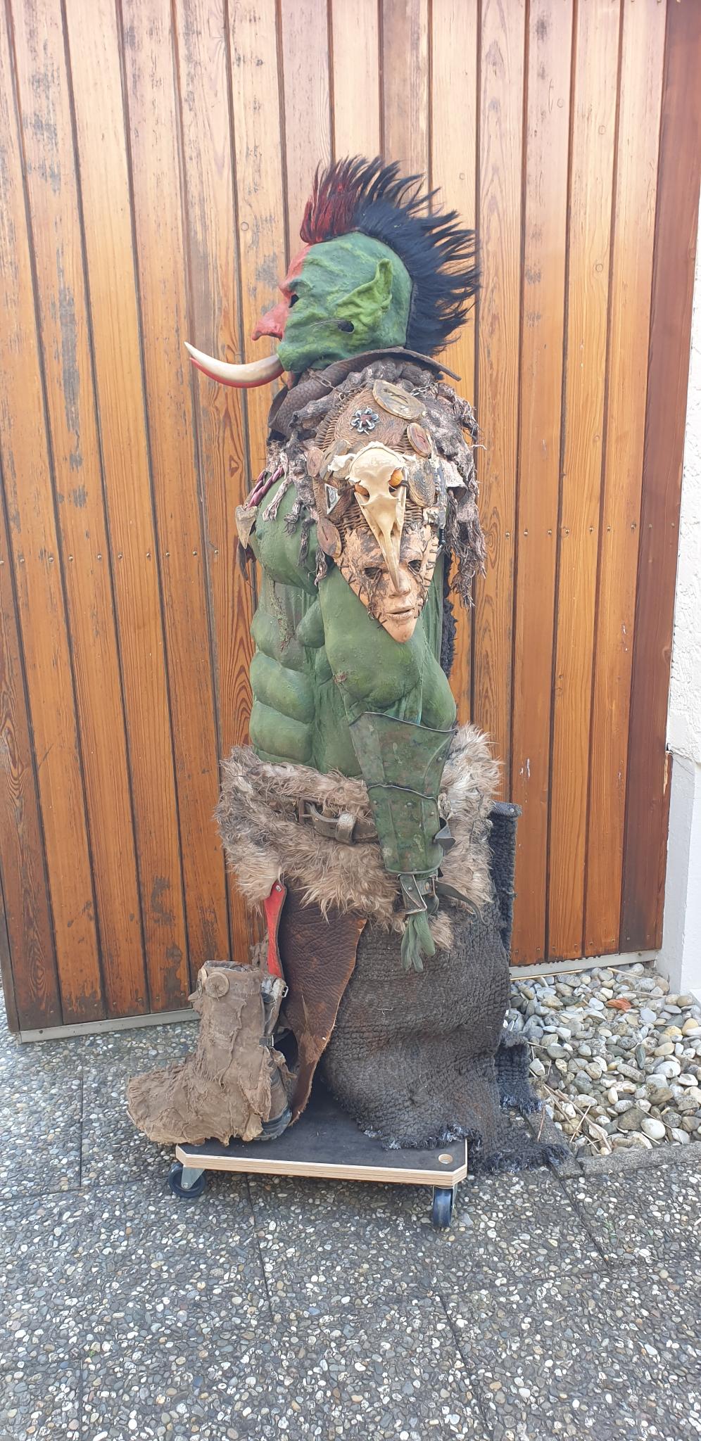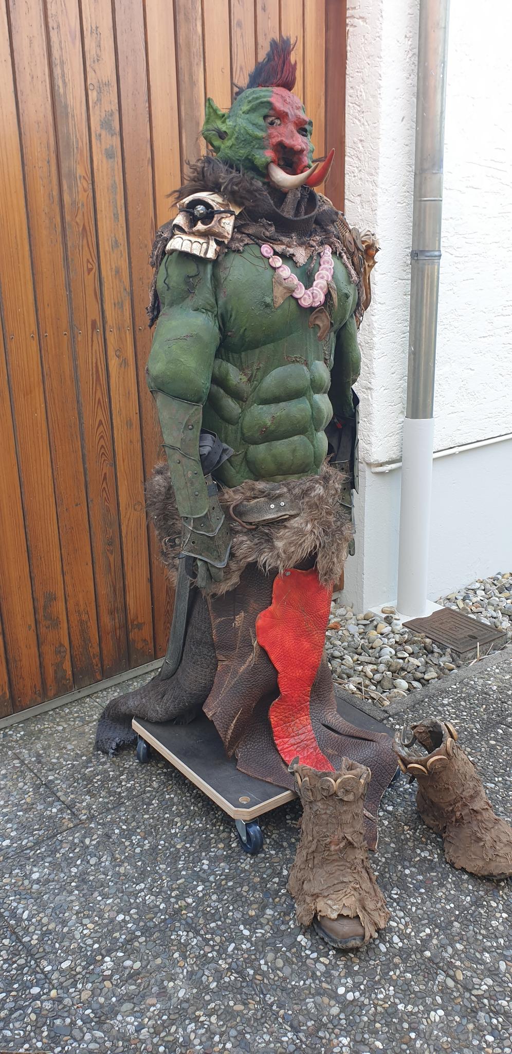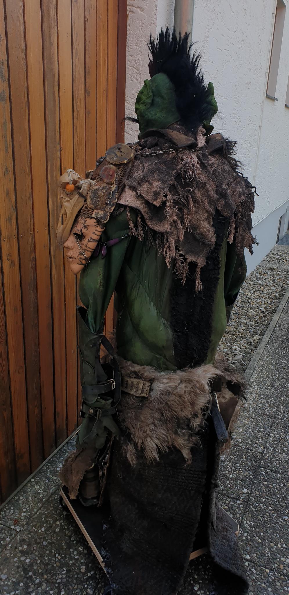Hier mein neuer Bodysuit in der Rundumansicht. Stiefelabtarnung habe ich mal mit den leeren Stiefeln davor gestellt und die Maske mit Stoff gestopft und mit Willenskraft an den Halsstumpf geklebt. Ich hoffe die Details sind auf der Puppe gut zu sehen, ich würde mich schwer tun das Kostüm zu tragen und mich zu fotografieren.