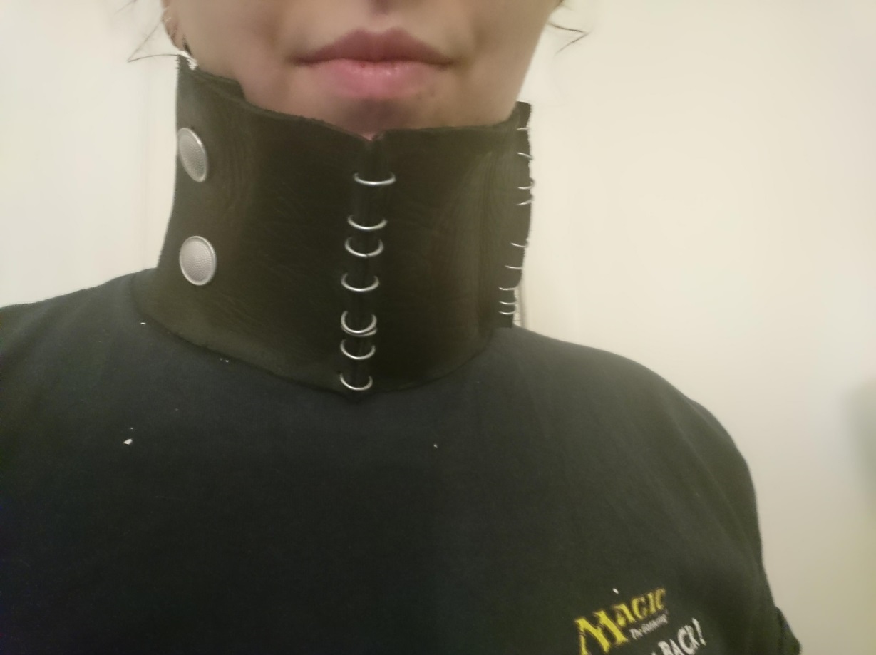 Der Mensch von dem ich das Leder bekommen habe hat mir außerdem ein Reststück schwarzes, etwas dickeres Leder mitgeschickt, aus dem ich mit Kettenringen und Metallknöpfen einen Kragen zum Hals abtarnen gebastelt habe.