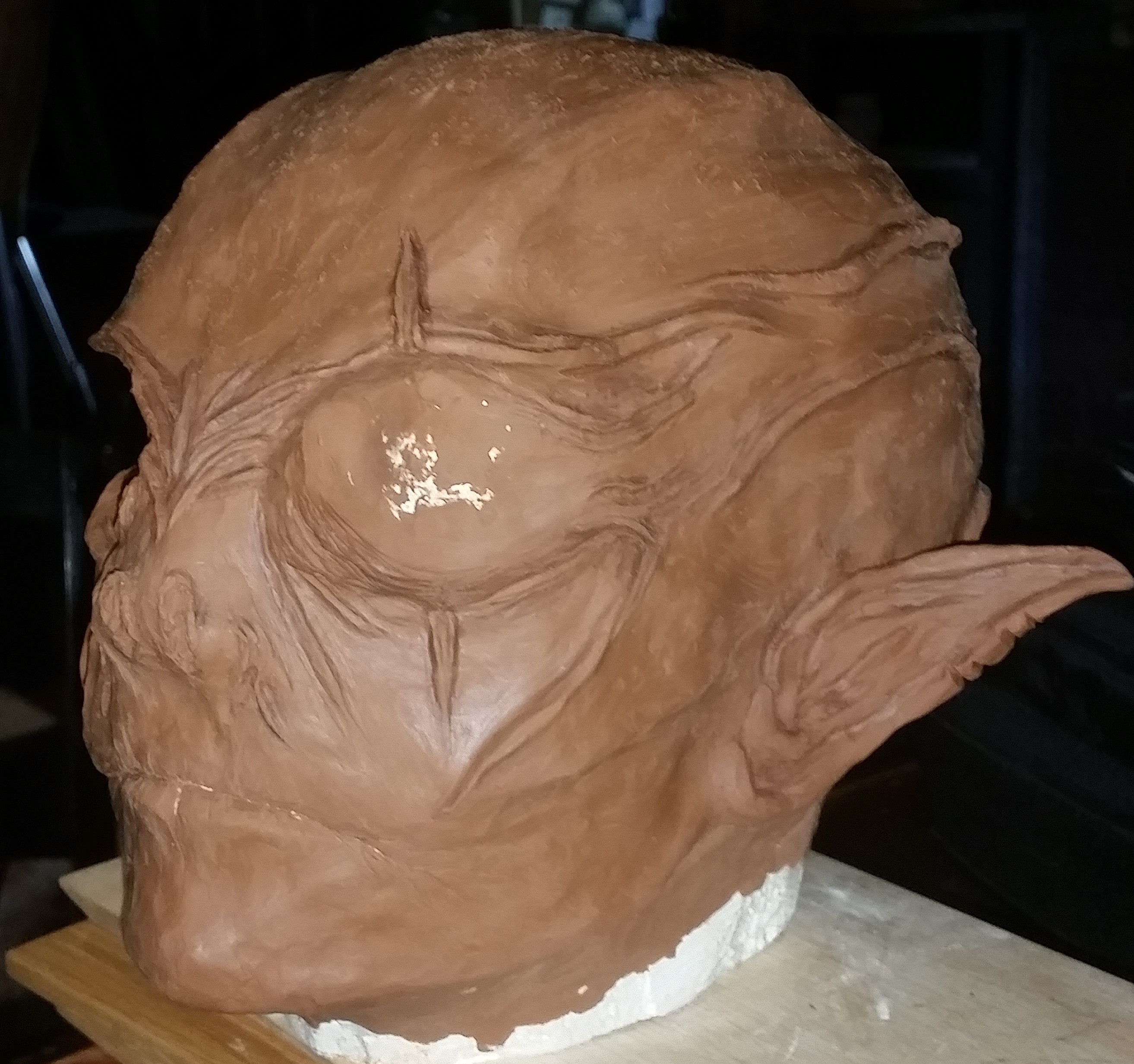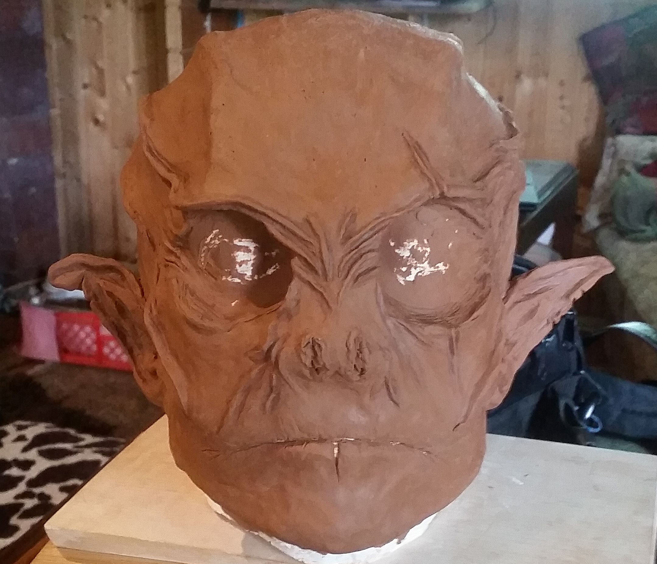 Ich würde die Partie um die Augen noch ausmodellieren. So das du am Ende genau weißt wo du die Augen ausschneiden sollst. Wenn deine Augenlöcher später nicht zu groß sind wirkt die Optik der Maske auch hübscher als wenn du Da jetzt einfach auf einer planen Fläche 2 Löcher reinschneidest.