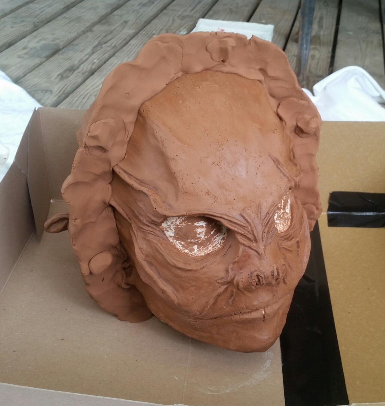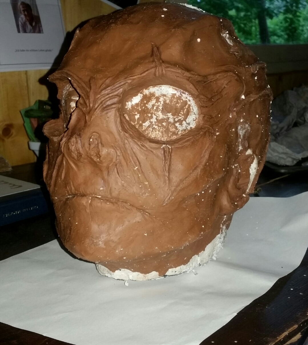 Neee nix festkleben. Ich modelliere meist so das Augapfel,Augenlied des Trägers optisch mit dem Sculpt verschmelzen. Dadurch wirkt alles organischer und das ist meiner Meinung nach öfters das Problem was einige Ungebile Masken haben. Die Augenlöcher liegen manchmal nicht gut an und da kann man dann bei der Maske am Auge des Trägers vorbei gucken. Und dann klafft da quasi ein Loch im Gesicht weil die Augenhöhlen der Maske vom Gesicht abstehen.