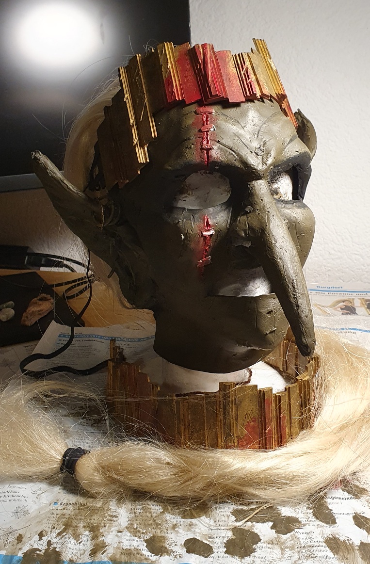 Eine weniger schlaue Aktion meinerseits war es, die Hsutfarbe der vorhandene Maske wechseln zu wollen und das mit Acrylfarbe umzusetzen. Das war nicht ideal, weil ich verschiedene tolle Details verloren habe und weil ich später erfuhr, dass Acrylfarbe ohne Latexbeimischung über Zeit dazu tendiert, abzublättern. Glück im Unglück, dass ich mit dunkelgrau (vorherige Hautfarbe) schattiert habe. Möglicherweise fällt das dann nicht so sehr auf oder ich kriege die Hautunreinheiten, die aktuell noch fehlen. : ;D