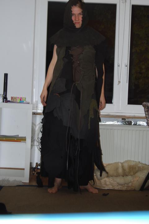 So. Hier mal Zwischenstand. Hab mal weiter nen bisschen rumgebastelt. Das Oberteil besteht aus verschiedenen Lederstücken, die mit Lederbändern zusammengehalten werden. Bis auf den Rock ist noch nix verorkt. Besonders die Gugel sieht noch sehr blöd aus so. Unten drunter will ich 2 Shirts, vielleicht grün und braun ziehen und die dann nen bisschen zersägen und noch mit Schlammfarbe einsiffen. Hab heute schokobraune Abtönfarbe gekauft.
