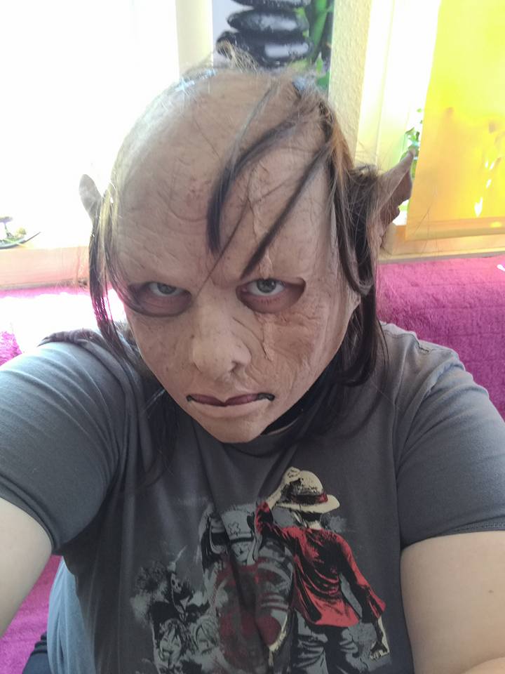 Die 3/4 Maske Orc weiblich mit Sturmhaube drunter. Bisher hält das Make-up ganz gut. Das mit den Bildern Versuche ich Mal.