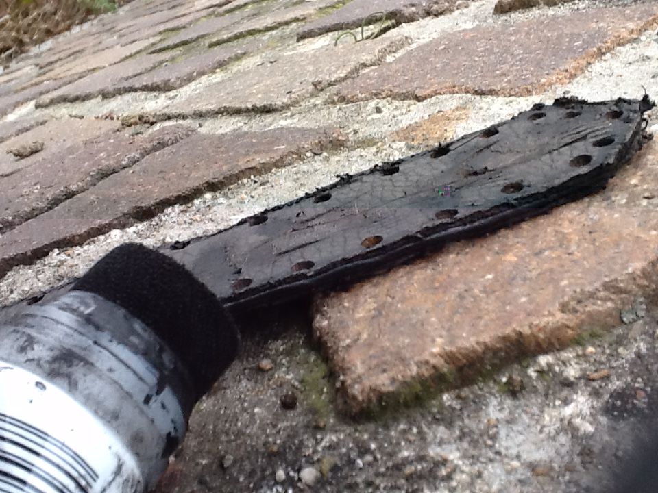 5. Schritt: Da man sieht, dass es mehrere Lederschichten/Riemen sind und das spätere "verorken" (Einsiffen und mit Gebrauchspuren versehen) aufgrund der späteren Lederbandnaht mühseliger wird, kommt jetzt bereits die Holzraspel zum Einsatz. Die Kanten der Riemen werden an die Kante eines Pflastersteins gelegt und rau geraspelt. Schürfstellen werden auf den Riemenflächen eingeraspelt und angeraut und mit der Kante der Holzraspel werden Macken reingesägt. Mit der handlichen, kleinen Säge wird jeder Riemen mit Schnitten versetzt. (Cuttermesser tut's auch.)