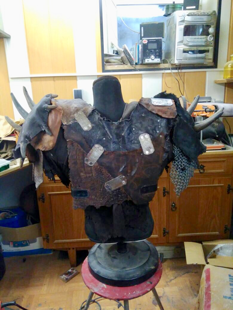 Im weiteren Verlauf wurde der Brustpanzer mit Hammer, Schuhcreme,Flex etc. etwas bearbeitet um anzufangen das Leder etwas abgenutzer aussehen zu lassen. Da wird aber noch nochmal etwas an Zeit drauf gehen um es so zu "verranzen", dass es wirklich schön abgenutz aussieht.