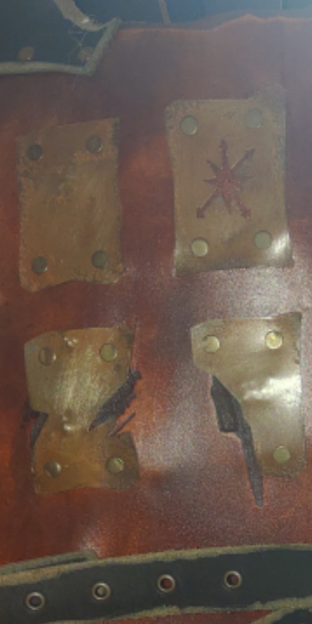 Detail Aufnahmen der Kanten vom Brustpanzer. Ist das zu scharf? Sie sind abgeschliffen und haben Rost an den Kanten (Farbe)