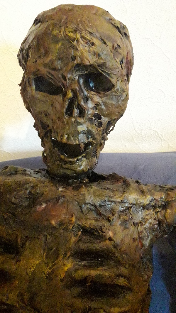 Dann hatte ich ja meine "Rotting Skulls" gemacht. (Zu sehen im gleich betitelten Thread) Also Schaumschädel mit Watte und Latex verschönert. Laut Internet nennt sich sowas "Corpsing" also etwa Skelette und Schädel, oder andere Skelettteile (zb Hände) nach verwesender oder mumifizierter Leiche aussehen lassen.