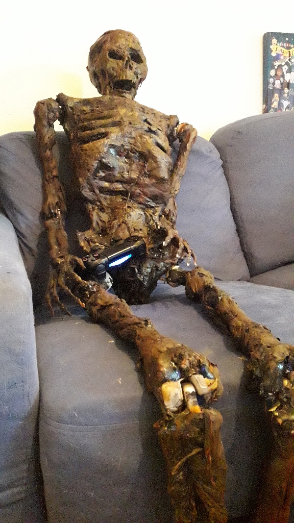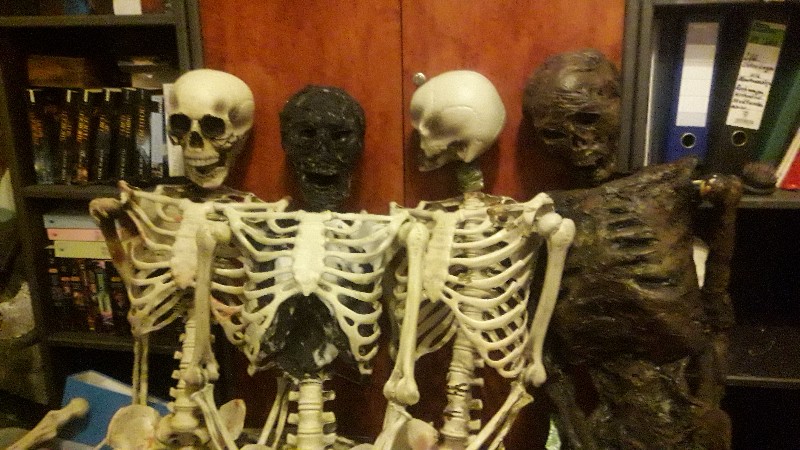 Hallo Freunde mit den Gummigesichtern. Die Horrgarch Mok hatten ja 2018 zwei Halloween Skelette mit festgeföhnter Spezialfolie als Leichen mit aufm DF.