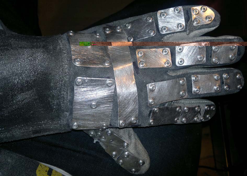 So, das ist der Handschuh mit allen Metallplatten drauf. Jetzt folgen noch Farben und Lederfetzen etc.
