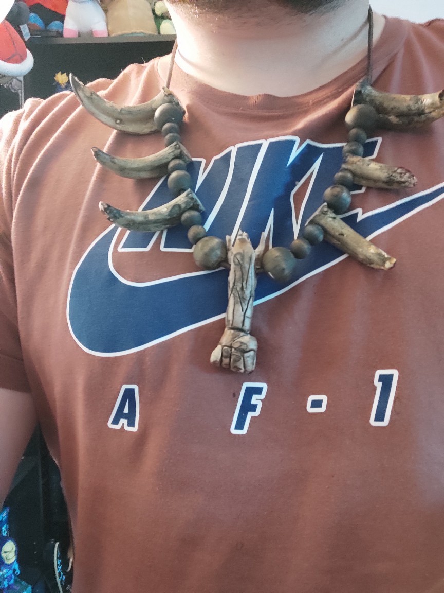 Einmal mit ner Beinschnitzerei der großen Mutter und einmal mit der Faust des Vernichters