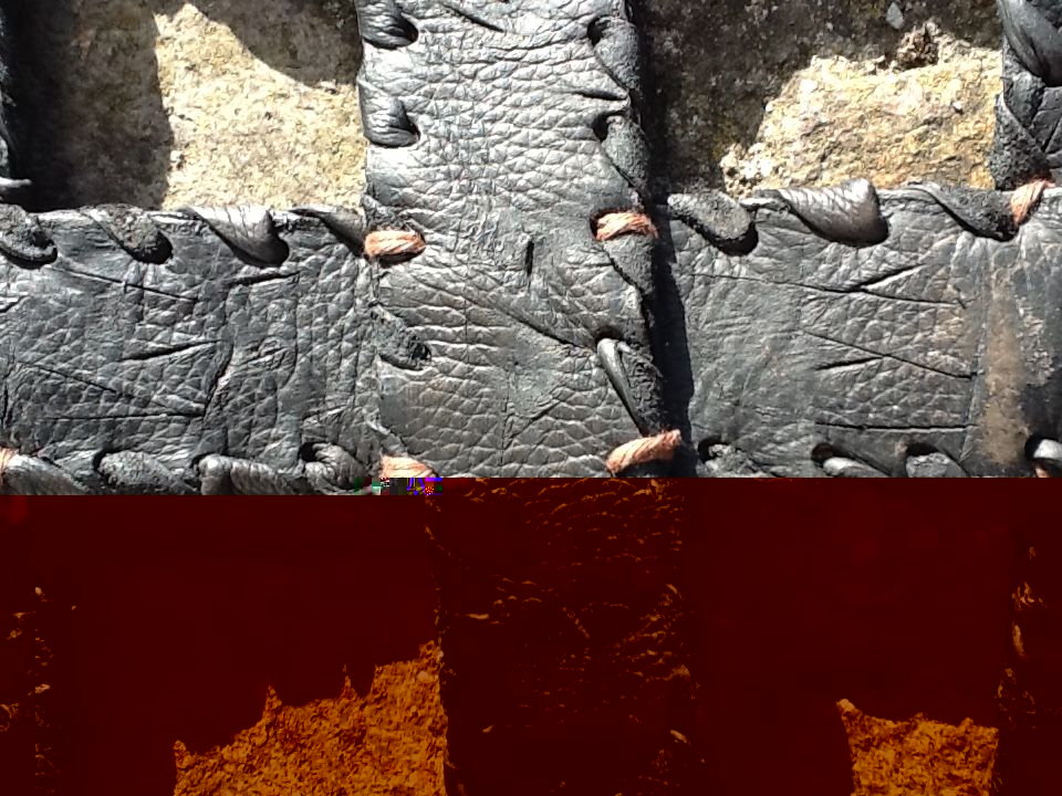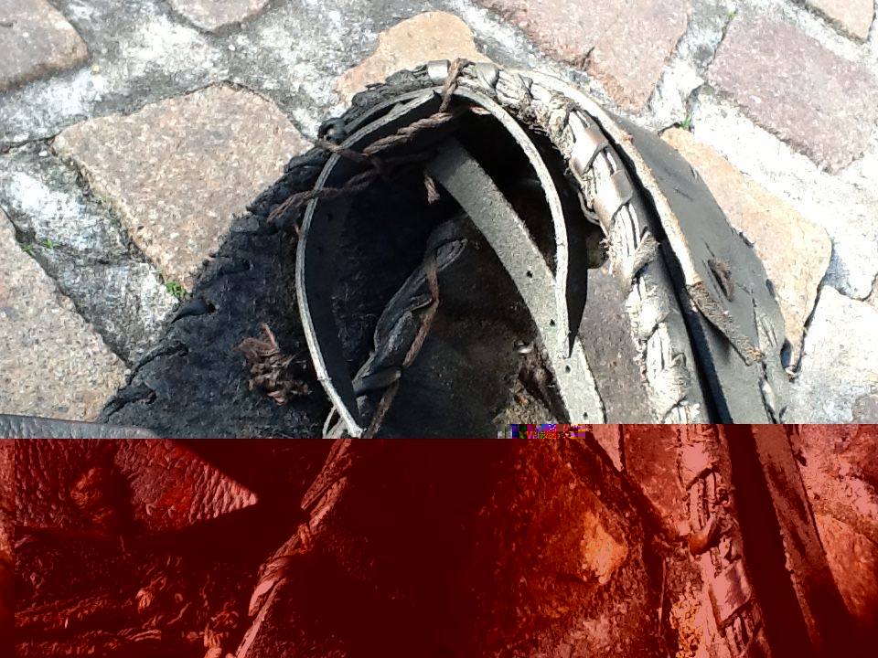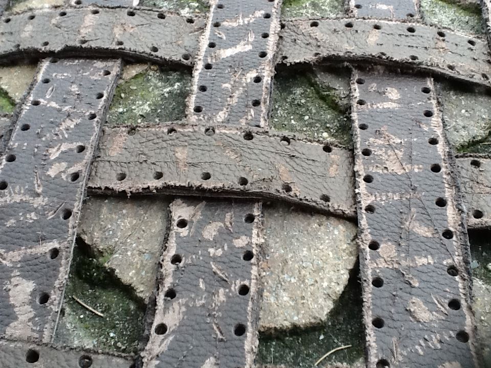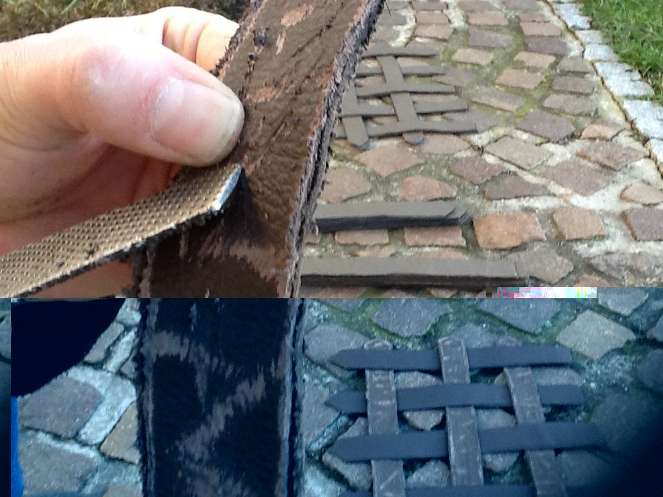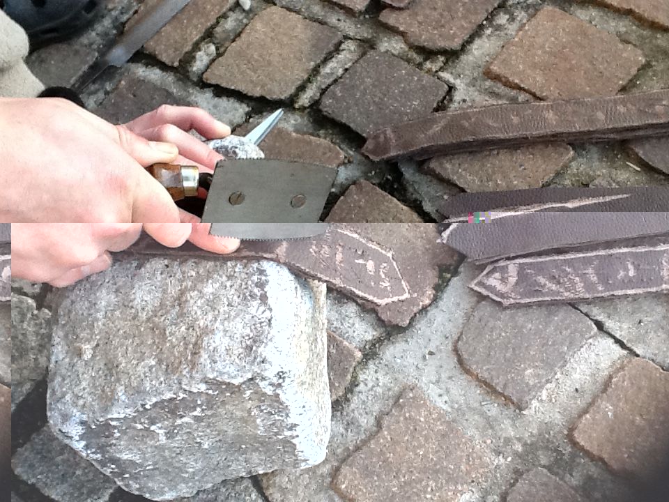 5. Schritt: Da man sieht, dass es mehrere Lederschichten/Riemen sind und das spätere "verorken" (Einsiffen und mit Gebrauchspuren versehen) aufgrund der späteren Lederbandnaht mühseliger wird, kommt jetzt bereits die Holzraspel zum Einsatz. Die Kanten der Riemen werden an die Kante eines Pflastersteins gelegt und rau geraspelt. Schürfstellen werden auf den Riemenflächen eingeraspelt und angeraut und mit der Kante der Holzraspel werden Macken reingesägt. Mit der handlichen, kleinen Säge wird jeder Riemen mit Schnitten versetzt. (Cuttermesser tut's auch.)