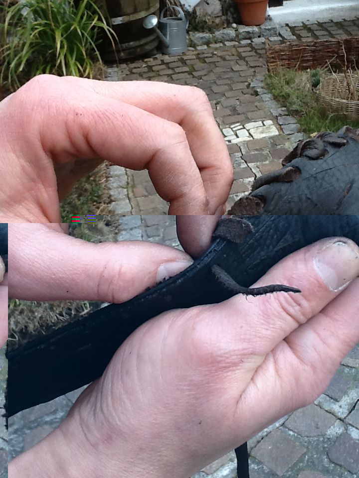 • Werkzeug: Maßband, Stift, 2 Gürtel als Schablone, Schere, Pflasterstein, Holzraspel, kleine Säge, Lochzange, Nähnadel, Wäscheklammern, Handschuhe /alles seit Jahren auf Halde