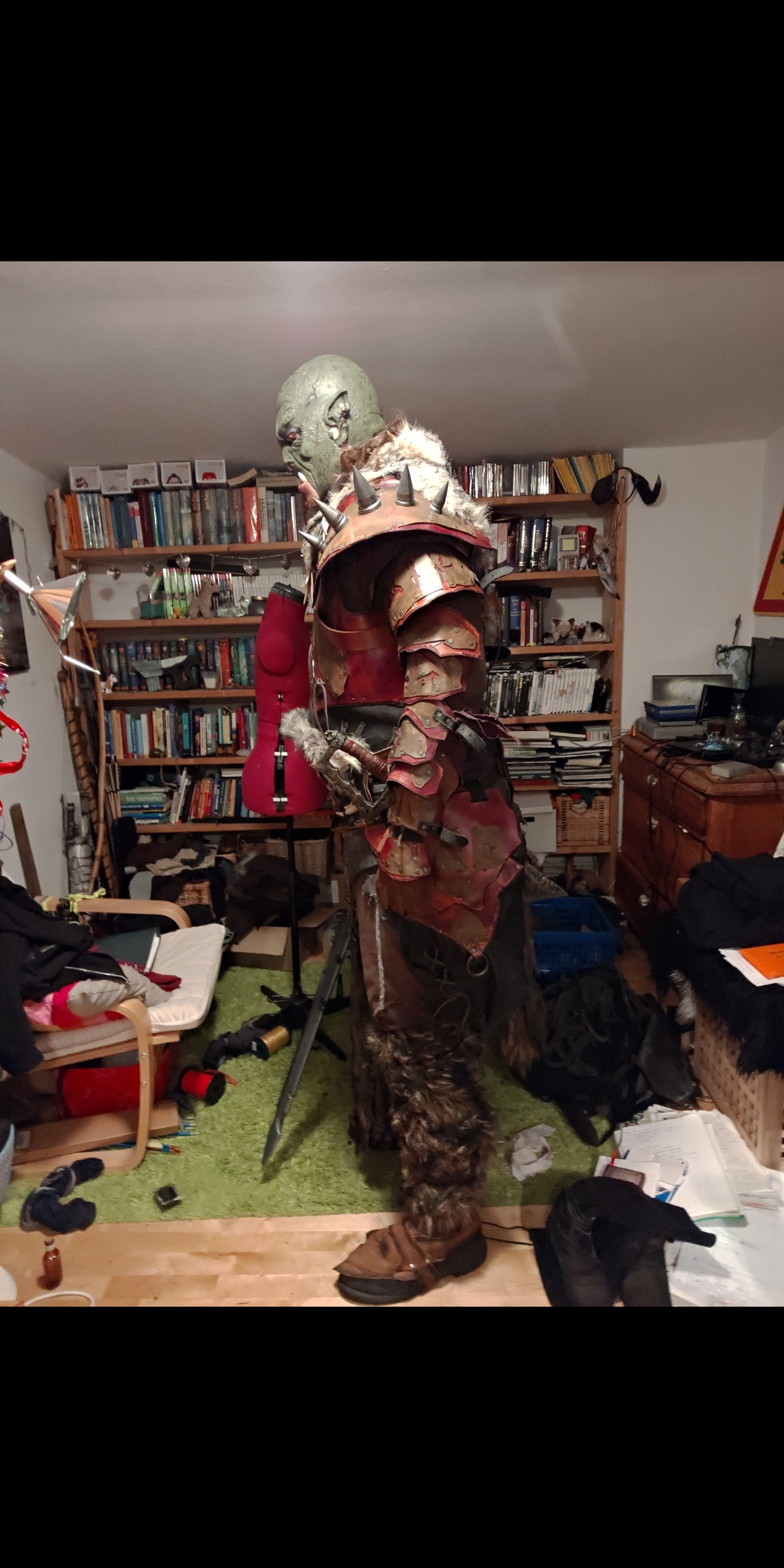So, Die Rüstung und Klamotte ist vorerst fertig. Die Fotos sind leider direkt unter Licht aufgenommen, somit reflektieren viele Oberflächen sauberer und glatter als sie eigentlich sind. Der hals ist von dem Fell sowie von braunem Stoff verdeckt. Ab morgen kann ich für eine Woche nicht an dem Outfit arbeiten, aber danach mach ich mich direkt wieder dran falls es noch irgendetwas zu verbessern gibt! Ich hoffe auf konstruktive Kritik und vielleicht schon auf einen Check. Grünes Make-Up für Mund, Ohröffnungen und Augen habe ich natürlich!.