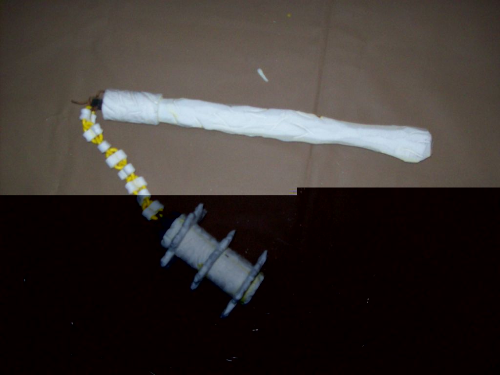 richtig. Hab nen Flegel mit Gartenschaluch als Kern im Kopf. Sichern vor Abriss ist wichtig. Als Kette hab ich ne Kette genommen (Kunstoff rot-weiss). Um die Bewegung und Gefahr des Einwickelns einzuschränken werden die Glieder mittig mit Schaumstoff umwickelt. Das ganze kann dan gelatext werden. Die Glieder schwingen sich denn bei Benutzung von Latext frei und reissen ein, was man kaum sieht... Bei Kloppern gibt es ja auch wichigeres als Optik